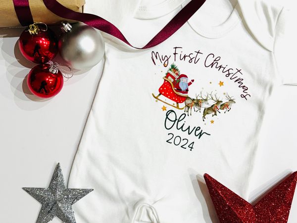 Each set includes a soft cotton bodysuit lovingly printed with your baby’s name and “My First Christmas” design, capturing the joy of this precious milestone. The coordinating pieces complete the look perfectly, making it an adorable outfit for Christmas morning, family photos, or festive cuddles by the tree.